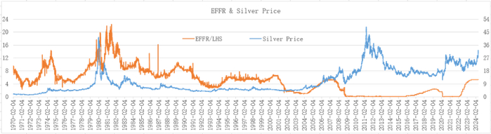 根据1970年以来的数据计算发现,联邦基金实际利率(EFFR)与白银价格之间的相关系数为-0.3989,呈较弱的负相关关系。总体上看,白银的贵金属属性得到一定体现,而且比工业属性更加突出一些。多数时候,当美联储加息时,EFFT上涨,白银价格下跌。