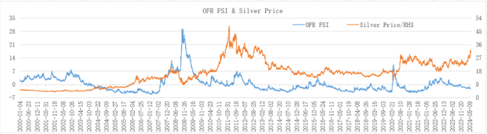 2000-2024年数据显示,金融研究办公室金融压力指数与白银价格之间的相关系数为-0.1258,同样存在极弱的负相关关系。