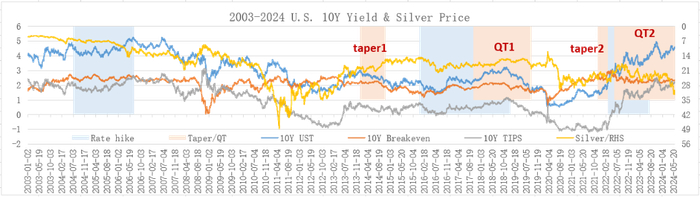 历史数据表明,盈亏平衡通胀率与白银之间的相关性较弱,相关程度仅在2020-2024年间有所提高,较弱的正相关关系表明通胀环境下,白银的商品属性具有一定吸引力。长期来看,10Y UST和10Y TIPS均与白银存在一定的负相关关系,2003-2024年间相关系数分别为-0.51和-0.6256,这是白银贵金属属性的体现。其中,2003-2019年间,10Y UST和10Y TIPS与白银的相关系数分别为-0.6010和-0.7210,2020-2024年间的相关系数分别变为0.0907和-0.0558,2022-2024年间进一步变为0.1839和0.1711,表明10Y UST和10Y TIPS与白银之间的相关关系从负相关逆转为正相关。