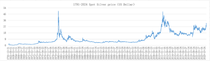 1791-2024年间的白银现货价格趋势如下图。根据白银现货价格在不同时期的表现及其影响因素的差异,《FICC与资产配置》系列文章第17篇《徘徊在熊市边缘的白银市场》将这一过程划分为8个阶段,但最近几年全球经济、政策、金融市场发生了重大变化,白银价格变化也呈现新的特点,有必要进行补充。
