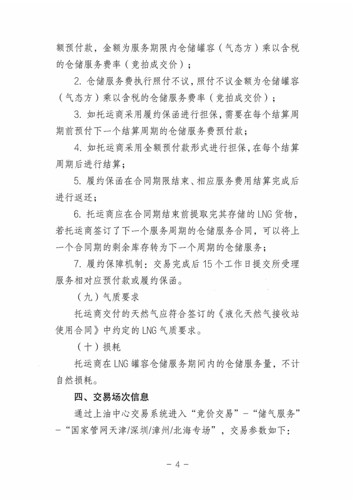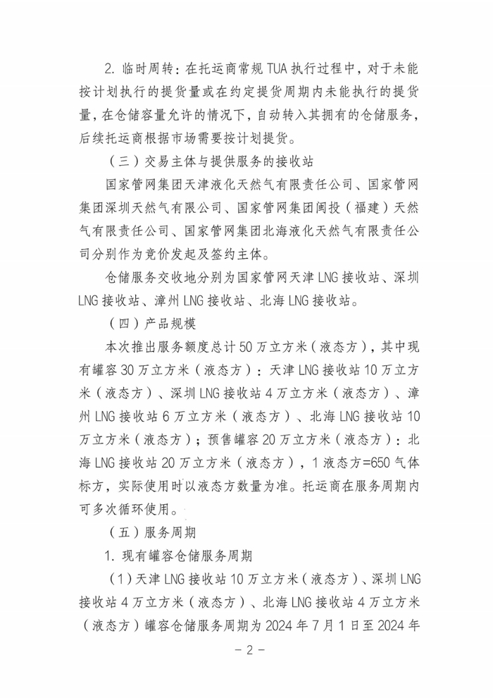 (1)天津LNG接收站10万立方米(液态方)、深圳LNG接收站4万立方米(液态方)、北海LNG接收站4万立方米(液态方)罐容仓储服务周期为2024年7月1日至2024年10月31日;