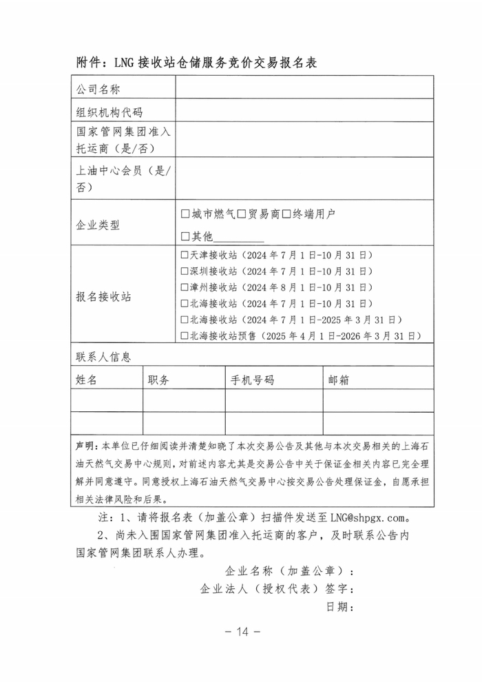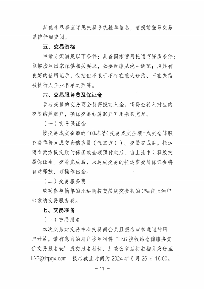 本次交易对交易中心交易商会员且报名审核通过的用户开放,请有意向的用户按照附件“LNG接收站仓储服务竞价交易报名表”提交报名材料,加盖公章后将扫描件发送至 LNG@shpgx.com,报名截止时间为2024年6月26日16:00。