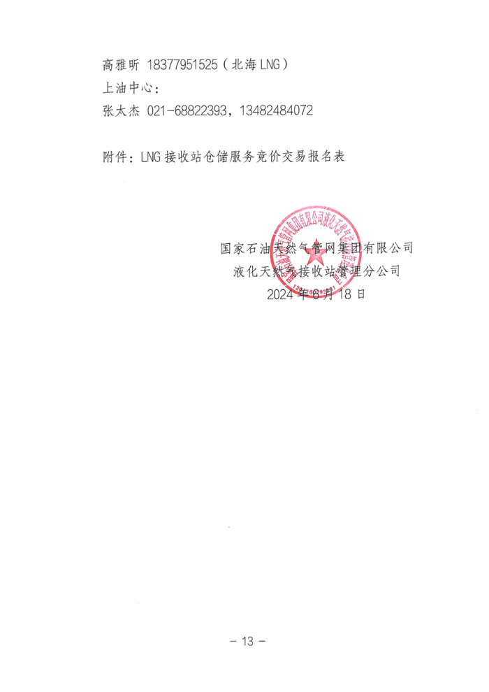 (3)北海LNG接收站6万立方米(液态方)罐容仓储服务周期为2024年7月1日至2025年3月31日。