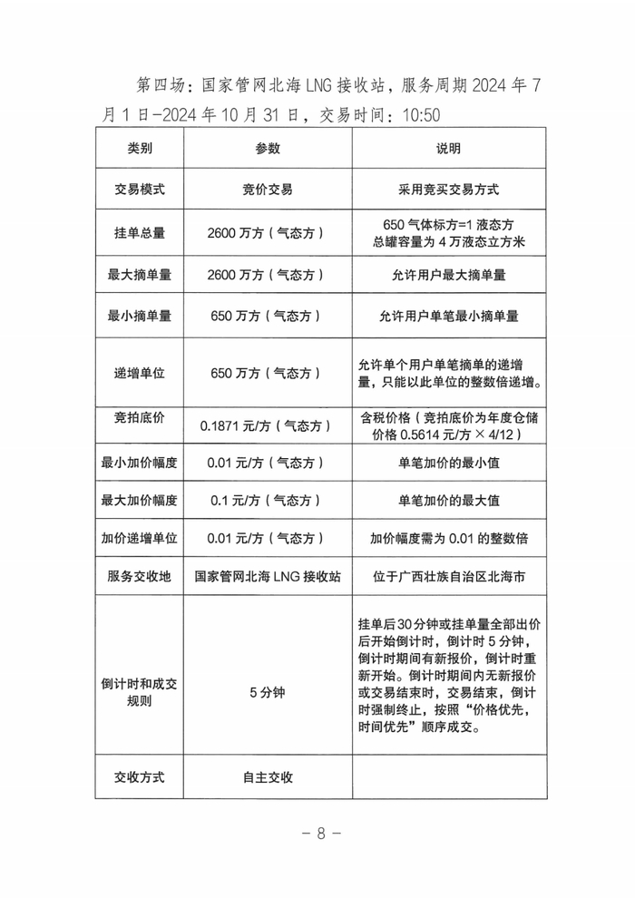 第五场:国家管网北海LNG接收站,服务周期2024年7月1日-2025年3月31日,交易时间:13:30