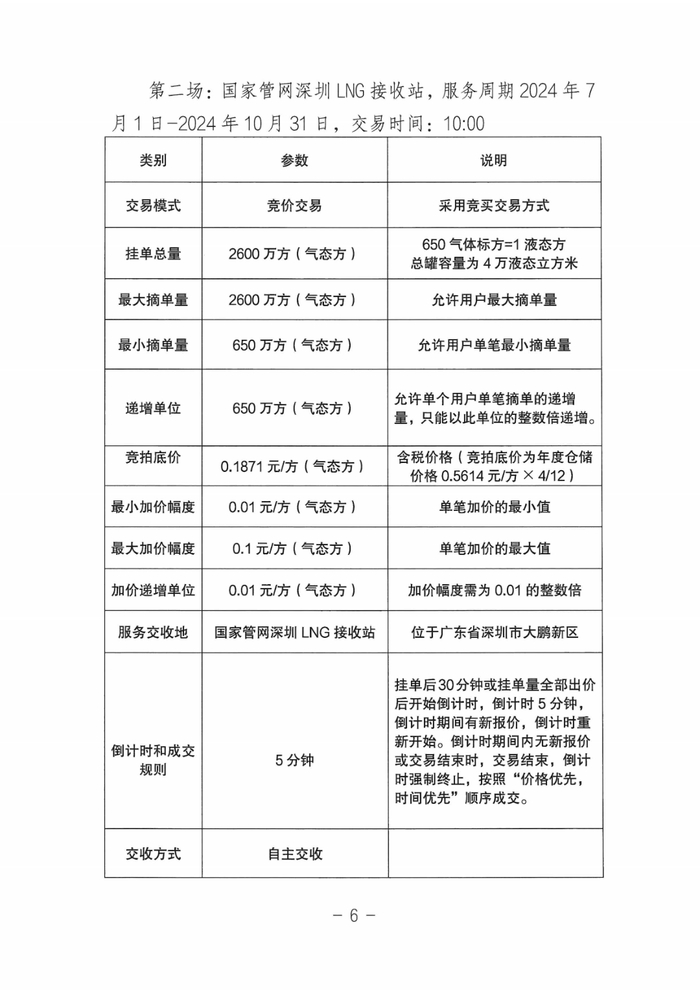 第二场:国家管网深圳LNG接收站,服务周期2024年7月1日-2024年10月31日,交易时间:10:00