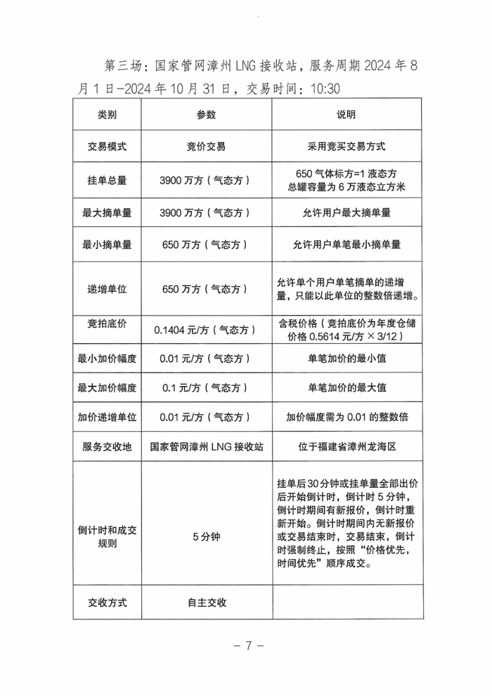 第三场:国家管网漳州LNG接收站,服务周期2024年8月1日-2024年10月31日,交易时间:10:30