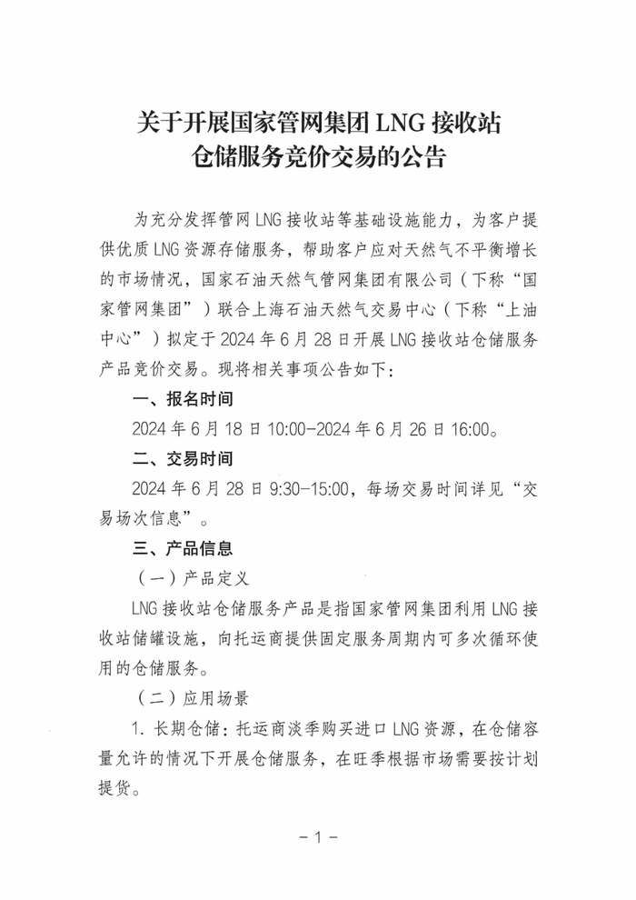 为充分发挥管网LNG接收站等基础设施能力,为客户提供优质LNG资源存储服务,帮助客户应对天然气不平衡增长的市场情况,国家石油天然气管网集团有限公司(下称“国家管网集团”)联合上海石油天然气交易中心(下称“上油中心”)拟定于2024年6月28日开展LNG接收站仓储服务产品竞价交易。现将相关事项公告如下: