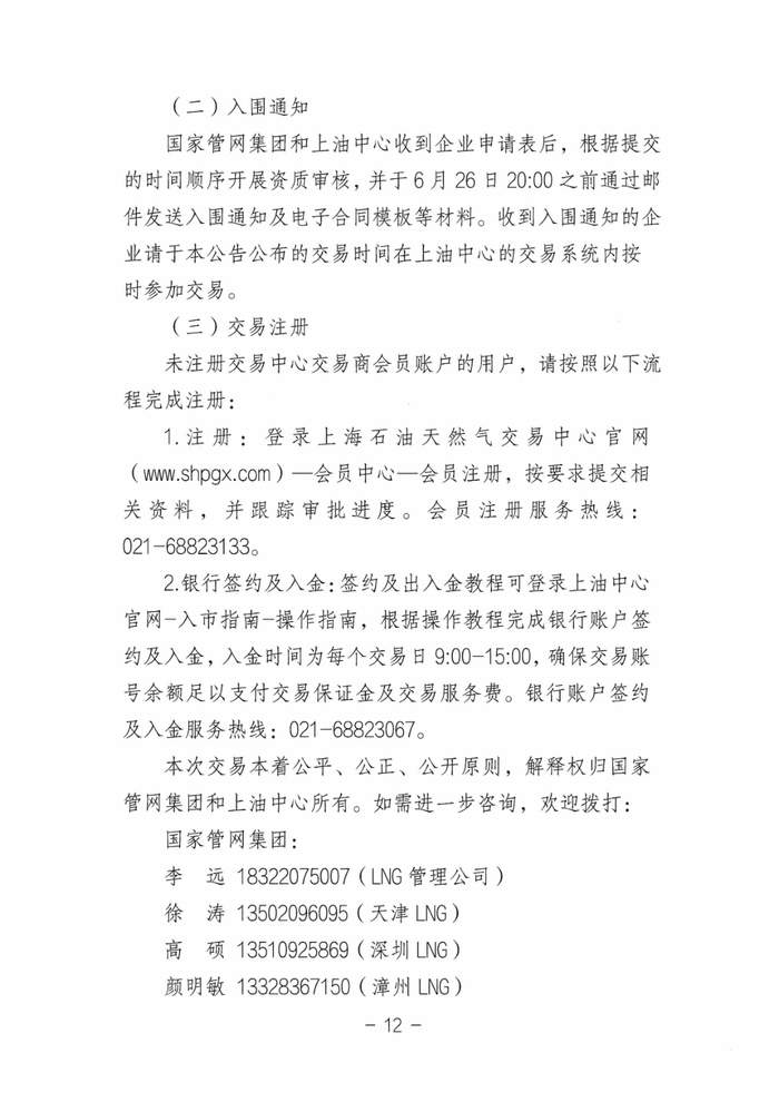 国家管网集团和上油中心收到企业申请表后,根据提交的时间顺序开展资质审核,并于6月26日20:00之前通过邮件发送入围通知及电子合同模板等材料。收到入围通知的企业请于本公告公布的交易时间在上油中心的交易系统内按时参加交易。