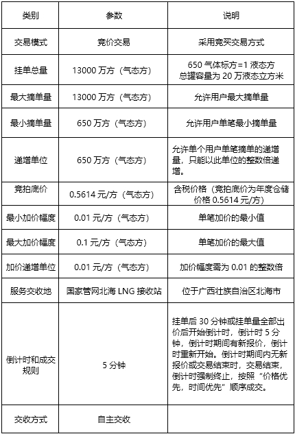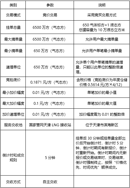 通过上油中心交易系统进入“竞价交易”-“储气服务”-“国家管网天津/深圳/漳州/北海专场”,交易参数如下: