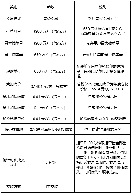 国家管网集团天津液化天然气有限责任公司、国家管网集团深圳天然气有限公司、国家管网集团闽投(福建)天然气有限责任公司、国家管网集团北海液化天然气有限责任公司分别作为竞价发起及签约主体。