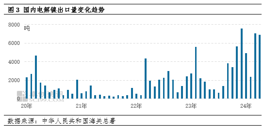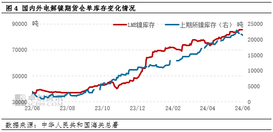 面对供应的持续增加,需求端却因不锈钢低迷行情表现并不乐观。卓创资讯数据显示,自2021年9月以来,国内不锈钢月产量均未能突破250万吨一线,偏低的开工情况延续至今,2024年1-5月国内不锈钢粗钢产量仅有1168.82万吨,较去年同期变动不明显。为此,国产镍板近几年纷纷注册的海外交易所的交割资格。出口量在一定程度上缓解了供应压力,但综合看效果并不明显,最终累库问题日趋严峻。其中海关总署数据显示,2024年1-4月电解镍出口量在21237吨,较去年同期增加8812吨,增加幅度高达70.92%。