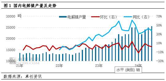 电解镍市场供应端主要集中在国内产量、进口量两个方面。伴随中资企业海外投产后的二级镍持续回流,近几年国内电解镍产能释放提速明显。卓创资讯数据显示,2024年1-5月国内电解镍产量在11.85万吨,吨,同比去年同期增加3.17万吨,增幅为36.52%,产量数据创新高。