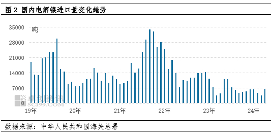 产量增加的对立面,进口量出现了明显下滑趋势,从近几年的进口趋势来看,2022年国内产能释放之后,电解镍进口量就出现了明显减少趋势。海关总署局势显示,2024年1-4月电解镍进口量在21391吨,较去年同期减少5747吨,减少幅度在21.18%。