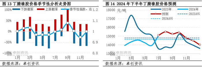 整体来看,下半年丁腈橡胶市场价格或整体呈现前高后低形态。三季度来看,原料丁二烯回调空间有限,仍将从成本端对丁腈橡胶形成支撑。此外7月份兰化5万吨/年产线检修,考虑“金九银十”的传统消费旺季,部分下游亦或自8月率先开启采购,市场供需差有望收窄,基本面亦有利于丁腈橡胶价格修复。四季度,原料丁二烯在供应预期增长背景下价格或出现较为明显的下行,成本面利空丁腈橡胶价格。而从基本面来看,四季度华东地区部分装置或存扩能预期,下游需求或季节性回落,基本面供大于求的格局亦将施压丁腈橡胶行情。因此综合上述分析,卓创资讯延续《2023-2024中国丁腈橡胶市场年度报告》中关于下半年的趋势预测,预计下半年丁腈橡胶市场价格或整体呈现前高后低形态。以兰化 3305E为例,卓创资讯预测下半年中国丁腈橡胶 3305E市场价格整体运行区间或在 13500-16000 元/吨,全年均价重心较 2023 年下移。