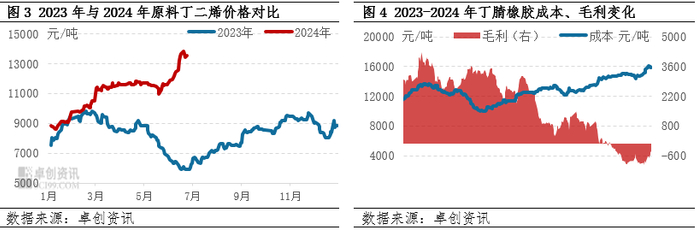 原料丁二烯的上涨是支撑上半年丁腈橡胶两轮上涨行情的最主要原因。上半年货少价扬可谓是丁二烯市场的主基调:进口方面,由于远洋货源运输成本增加及欧洲地区供应减少等影响,上半年远洋货源对亚洲市场补充极为有限;而东南亚地区部分丁二烯装置开工亦有所下滑,流入东北亚数量亦有所减少,尤其是流入中国丁二烯数量明显下滑。国产方面,裂解装置开工负荷不高、部分装置意外停车以及部分检修装置重启时间延后等,均导致国内丁二烯供应量不足。供应偏紧促使丁二烯市场价格持续上涨,丁腈橡胶生产成本压力不断加剧,截至6月20日,江浙市场丁二烯价格较2023年末上涨52.68%,丁腈橡胶毛利趋于负值。高位的成本夯实了丁腈橡胶价格底部。