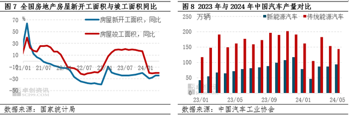 需求方面,从丁腈橡胶主要的终端消费市场房地产及汽车数据来看,房地产数据方面,1-5月份地产开工同比降幅较大,竣工面积继续下降。1-5月份房地产新开工面积同比下降24.2%,较1-4月的同比下降24.6%减少0.4个百分点;竣工面积同比下降19.8%,较1-4月的同比下降21%回升1.2个百分点;住宅竣工在2024年1-5月份的表现逐步回暖,但依然较弱。对于作为地产后端产品的丁腈橡胶而言,一方面竣工面积下降利空丁腈橡胶市场,另一方面中长预期下受到来自新开工面积下滑带来的需求约束,更是导致了部分操盘商对需求信心的不足。汽车方面,2024年1-5月中国汽车总产量1138.4万辆,同比增长6.5%,但传统能源汽车产量同比下滑2.8%。于丁腈橡胶而言,传统能源汽车的减量是丁腈橡胶需求欠佳所面临的现实之一。此外部分终端成品价格下滑,施压橡胶制品降价,中小规模下游企业接单能力减弱且利润较薄,因此对于橡胶原材料涨价接受能力有限,导致丁腈橡胶市场高价交投承压。