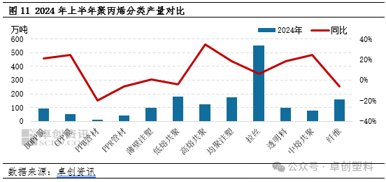 受新增产能投放以及下游消费特征变化的影响,2024年1-6月PP多数品种累计产量较去年同期呈现增长趋势,其中中、高熔共聚产量同比增幅明显。产量同比增长的细分领域来看,在新兴消费领域成为新的需求发展方向背景下,家电、汽车除了受“以旧换新”政策提振外,消费升级也令绿色智能家电、汽车迎来发展机遇期,上半年家电、汽车内外销表现强劲,PP生产企业更是考虑到生产利润、竞争压力、品种价差等因素,更乐于研发和产出高附加值产品,因此涉及家电和汽车生产的中、高熔共聚上半年产量同比分别增长约24.62%和34.94%。此外,2024年居民收入延续恢复性增长和消费意愿的回暖也令包装需求表现较好,加之BOPP和CPP产能的增长,上半年BOPP和CPP膜料产量同比分别增长约21.00%和24.74%。产量同比下降的细分领域来看,主要是管材料降幅明显。由于PP管材受终端地产需求恢复较慢影响较大,而1—5月份,房地产开发企业房屋竣工面积同比下降20.1%,其中住宅竣工面积同比下降19.8%,整体表现依旧偏弱。年中地产虽受政策驱动新开工有所改善,但销售、库存等指标未有起色,因此地产市场仍处在调整过程中,国内PP生产企业对PP管材的排产比例长期维持在偏低水平,上半年PPR和PPB管材产量同比下降6.38%和19.64%。