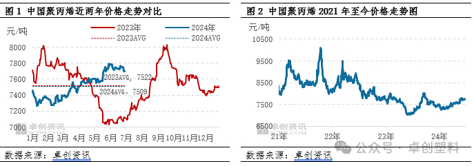 2024年上半年PP市场拉丝产品的运行的低点出现在1月中上旬,供强需弱令基本面承压,加之期货连续走低压制,场内现货报盘随行下调至上半年低点。然随着PP价格走低触及买方心理价位,市场逢低备货氛围有所好转。伴随着期货止跌反弹及宏观面利好消息显现,现货市场操盘情绪得以提振而报盘上涨,但临近春节假期,下游备货行情逐步进入尾声,涨势表现较缓。节后归来,原油高位及期货开盘上涨支撑,节后PP市场延续节前涨势。3-4月,前端检修装置增多叠加下游阶段性备货行情带动,PP市场价格重心继续上移。但有效需求跟进持续性不佳令PP市场交投心态受挫,涨势随之放缓进入阶段整理环节。进入5月份,在新产能投放慢于预期且检修较集中,供应预期压力未兑现的情况下,宏观面多项房地产刺激政策出台,令市场信心进一步提升,加之PP期货向好运行,众利多促使PP价格震荡冲高至上半年高点7790元/吨。6月随着宏观利好情绪逐渐消化,市场逐步回归供需主导逻辑中,月内供需双弱与高成本博弈,PP价格高位震荡为主。