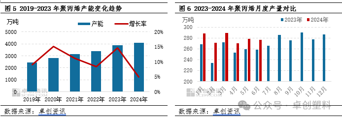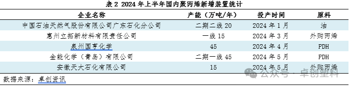 国内PP产能继续扩增过程当中。据卓创资讯数据统计,上半年国内PP新增产能在140万吨,截至目前国内PP总产能达4082万吨。从投产时间来看,2024年上半年新增产能投放时间有所滞后,一季度仅投放35万吨,受高成本压制以及春节前后需求表现不及预期等影响生产企业投产步伐有所放缓,而3月中旬起检修装置逐步增加,也较大程度上削减了新增产能的冲击,市场整体供应压力变动不大。二季度新增产能投放较一季度有所增加,但二季度国内检修装置集中,供应端整体来看,压力不大,部分区域甚至出现货源的结构性偏紧态势。从原料来源看,上半年以PDH制PP投放为主,其次为外购丙烯制PP,油制PP少量投放其他原料来源PP暂无投放。从产能投放区域来看,新增产能多集中在华南区域,对当地供应冲击力度较大。