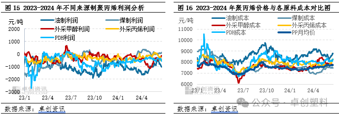 PP的原料来源多样,且原油、煤炭及丙烷等原料价格依旧高位运行,相较于PP估值,PP成本估值相对较高,因此成本对PP成本端支撑仍存。而从企业毛利来看,多数PP厂家仍处亏损状态徘徊,虽然年内有部分企业毛利修复转正,但多数仍难以摆脱亏损态势。从2024年上半年来看,油制PP成本涨势明显,均值在8637元/吨,同比去年成本提升5.14%,而油制PP毛利均值在-1106元/吨,同比去年下跌383元/吨,跌幅在34.63%。煤制PP成本均值同比去年成本降低762元/吨,跌幅10.36%,煤制PP毛利均值在-111元/吨,同比去年上涨755元/吨,涨幅在678.76%。除此之外,其余原料路径的成本均有不同程度的上涨或下跌但总体成本水平相对偏高。