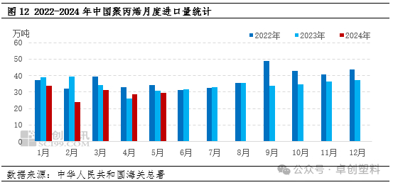 2024年受新产能投放的影响,产量均高于去年同期。据卓创资讯统计,2024年1-6月份PP累计产量在1674.28万吨,较去年同期增加8.33%。分月来看,由于广东石化二期在2月顺利投产,3月PP产量增幅最为明显,达到半年内最高位,环比2月增长6.40%,同比增长6.16%。2月份处于春节假期且自然日最少,2月份产量有一个较大的跌幅,但国产量最低点出现在4月份,4月装置检修较为集中,开工负荷率环比3月份下降3.02%,4月PP产量环比3月下降6.60%。