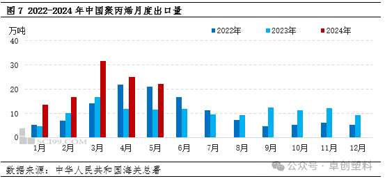 因产能带来的PP产品竞价加剧,国内PP价格一度处于全球洼地,随之而来的是出口总量出现快速增加,并一度超越进口量。据卓创资讯数据统计,1-5月PP累计出口109.26万吨,同比增长98.30%。结合到上半年具体行情来看,一季度PP出口量逐月递增,主要原因是海外中东以及东南亚地区装置整体检修力度较大,海外供应相对偏紧,而国内石化企业节后累库较高,但国内需求恢复有限,一定程度上刺激石化厂家和贸易商出口积极性,此外我国PP出口价格整体上处于相对低位,价格优势较大,也为我国PP出口创造了机会。4-5月海外需求表现不佳,受东南亚开斋节以及印度选举等影响,海外需求有所走弱,但海外检修装置逐渐回归,海外供应偏紧问题得到缓解,叠加海运费上涨,我国PP出口到港报价与中东韩国等地区相比竞争力不大,PP出口市场竞争日益激烈,PP出口量难有放量。6月份来看,出口窗口关闭以及海运费高企、海外需求偏弱问题短期内难以解决,PP出口较疲软,预计6月份PP出口在20.15万吨,环比5月小幅下滑,预计2024年上半年PP出口在129.41万吨,同比增长93.27%,上半年PP出口增速较高,对国内供需基本面压力有所缓解,一定程度上支撑PP市场价格。