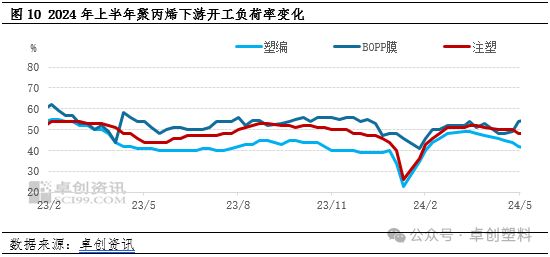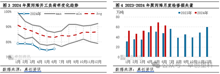 装置检修增加最直观的体现在于PP行业开工负荷率的变化。2024年上半年,PP行业开工负荷率明显低于历史五年均值。据卓创资讯统计,2024年1-6月PP行业月度开工负荷率平均在76.85%,同比下跌 4.09个百分点,其中5月下滑至上半年最低点74.48%,同比走低3.20个百分点。2024年上半年PP生产企业利润水平多为亏损状态,生产企业检修降负荷行为不断,使得行业开工负荷率呈现下跌趋势,产能利用率明显下降。
