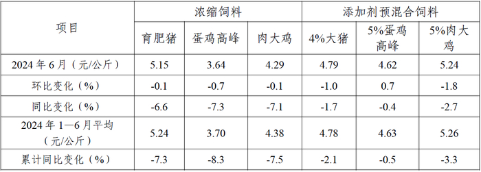 表3 2024年6月饲料企业浓缩饲料和添加剂预混合饲料平均价格