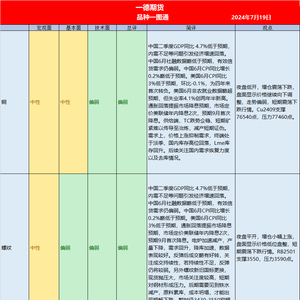 ◆ 简评:中国二季度GDP同比4.7%低于预期,内需不足等问题引发经济增速回落。中国6月社融数据略低于预期,有效信贷需求仍偏弱。中国6月CPI同比增长0.2%略低于预期。美国6月CPI同比3%低于预期,环比-0.1%,为四年来首次转负。美国6月非农就业数据略超预期,但失业率4.1%创两年半新高。通胀回落提振市场降息预期,市场定价美联储年内降息2次,预期9月首次降息。供给端,TC跌势企稳,短期矿紧难以传导至冶炼,减产短期证伪。需求上,价格上涨抑制需求,终端处于淡季,国内库存高位回落,Lme库存回升。后续关注国内需求恢复力度以及去库情况。