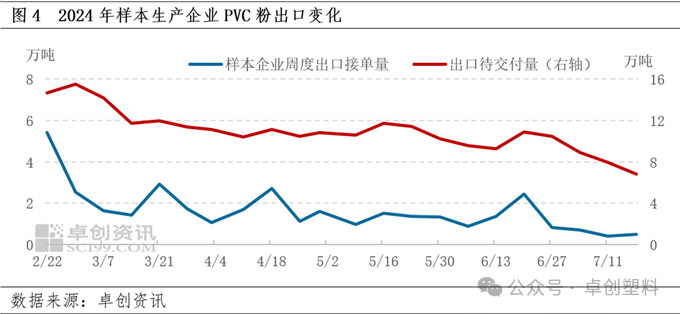 通常7-8月处在印度的雨季,对PVC粉的需求相对偏弱。但2024年由于印度PVC粉进口政策出现了一些变化,印度客户采购PVC粉的节奏有所改变,预计也将影响国内PVC粉7-8月的出口量。