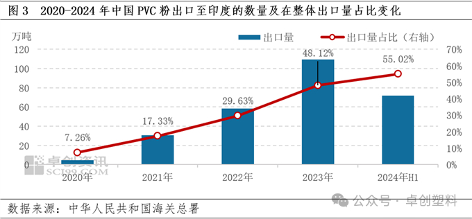 上半年PVC粉出口量同比提升,出口至印度的数量增幅明显