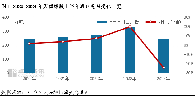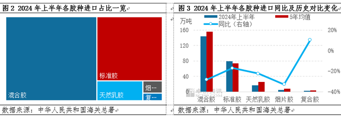 导语】2024年上半年天然橡胶累计进口量247.15万吨,同比跌幅超20%,主要进口胶种混合胶、标准胶同比下跌明显。下半年海外主产区陆续步入旺产季,产出增量或支撑中国进口量呈现增长趋势;然国内下游需求增量空间有限叠加EUDR分流,预计下半年进口量同比增长或承压。