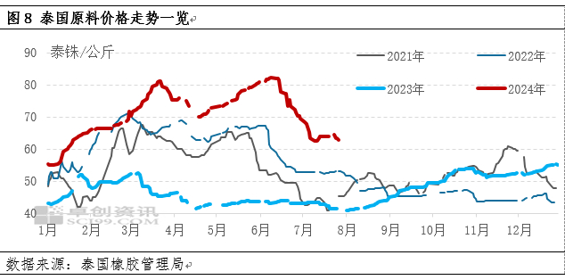 天然橡胶产出具有明显的季节性特征,一般来看下半年全球天然橡胶主产区将陆续由增产季迈入旺产季,且伴随原料价格季节性上量回调,上游加工厂加工利润得到修复支撑生产积极性,预计供应将呈现放大趋势。另外因原料价格对比同期来看仍处于高位区间,高价原料刺激割胶积极性,支撑供应上量。因此下半年海外主产区旺产季叠加高价原料刺激产出,预计中国进口量或较上半年实现增长。