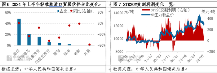 标准胶作为第二大进口胶种,今年上半年累计进口量79.07万吨,同比减少16.99%。进口国别来看,其中自泰国的进口标准胶38.1万吨稳居第一位,占比48%,同比增长48%,由于中国轮胎出口市场维持高位以及标胶交割利润支撑自泰国标准胶进口量呈现增长态势。上半年自科特迪瓦进口标准胶总量约16.75万吨位居第二位,占比21%,同比下滑38.03%,内外盘倒挂抑制国内进口积极性,此外受EUDR政策影响非洲优先出口欧盟国家从而分流至中国的体量。