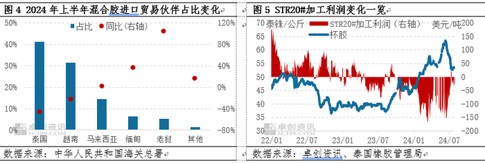 混合胶作为第一大进口胶种,今年上半年累计进口量144.12万吨,同比下滑28.34%。从进口国别来看,混合胶主要进口贸易伙伴进口量同比下滑明显,其中自泰国的进口混合胶59.24万吨位于首位,同比下滑45.88%,占比41%;自越南进口45.29万吨位居第二,同比下滑22.34%,占比31%。上半年,由于2023年主产国旺季不旺造成减产,今年新一轮开割季来临因原料价格高挺导致橡胶加工厂生产成本偏高,加工利润亏损,新胶上量滞后且缓慢,主产国出口下滑造成中国进口量走低。