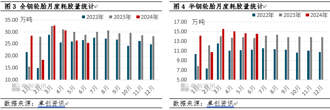 今年上半年,天然橡胶主要下游轮胎行业整体表现亮眼,据卓创资讯监测全钢轮胎生产企业统计数据显示,2024年1-6月中国全钢轮胎累计产量6742.9万条,同比上升0.01%;中国半钢轮胎累计产量31278.42万条,同比上升11.91%。由此可见,上半年轮胎产量均呈现同比增长形态,尤其在出口市场支撑下,半钢轮胎累积产量同比增长超10%;从而支撑其对于天然橡胶整体消耗水平。1-6月轮胎(全钢+半钢)累积耗胶量246.94万吨,同比增长2%,整体耗胶量基本持平去年高基数水平。
