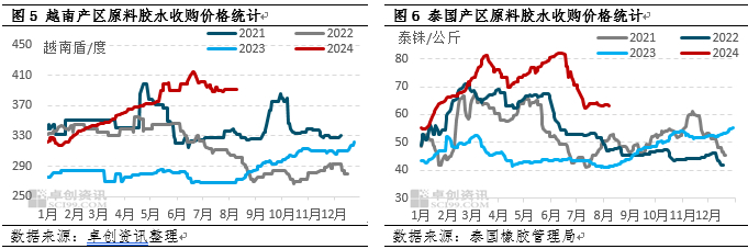 供应方面来看,下半年全球天然橡胶主产区将陆续由增产季迈入旺产季,高价原料或松动回调,生产企业加工利润窗口打开,企业生产积极性提升,预计新胶供应迎来充分释放;同时当前无论从国内产区还是国外产区来看,原料价格对比同期仍处相对高位,以越南、泰国产区原料胶水收购价格为例,截止到7月底越南西宁产区原料胶水参考391越南盾/度,同比增长43.75%;泰国产区原料胶水收购价格63.3泰铢/公斤,同比增长53.64%。原料收购价格高挺则刺激胶农割胶积极性,新胶供给弹性或放大。因此下半年供应将呈现增量,而中国进口量有望实现增长,国内供应端将逐渐趋于宽松。