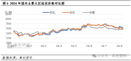 总体来看,供需发生变化,价格是最直接的反应载体。据卓创资讯数据显示,以拉丝价格为例,2024年国内华东、华南、华北三大区的价格表现发生了根本的变化,华南的主流价格基本降至国内最低的水平截至目前华南拉丝在7470-7630元/吨,远低于其他大区。虽然,区域内的厂家乃至国内厂家均对自身的排产结构进行了调整,但在绝对产量增加的背景下,暂时无法缓解供应增多带来的价格下滑压力。