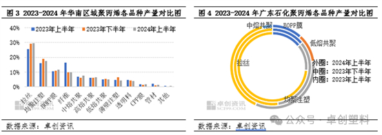 华南区域PP各品种来看,其中产量占比最大的为拉丝,2024年上半年在各品种中产量占比在29.5%,其次为均聚注塑占比为17.64%,再次为BOPP膜占比在11.73%,而中熔共聚这几年发展较快,2024年上半年华南区域中熔共聚环比2023年下半年增长21.83%,成为仅次于CPP膜的,产量环比增长最大的品种。