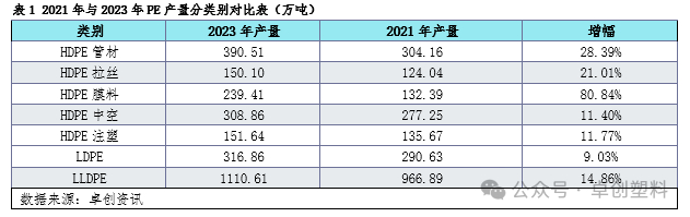 对比2021年与2023年PE分类别产量,可得下表,增幅较为明显的为HDPE膜料与HDPE管材,分别增幅在80.84%与28.39%。LDPE因新增产能较少,故实际产量变化幅度较小,增幅在9.03%。