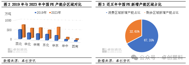 由图2可看出,西北区域位居中国PE产能首位,且近年来投产区域逐步向华北、华东、华南区域转移,即由生产区域向消费区域转移。截至2023年底,西北区域以720万吨PE产能位居首位,其次则为华东、华南区域,分别涉及产能642万吨与579万吨。且由图3可看出,消费区域新增产能占PE总新增产能的67.35%,新增产能逐渐向消费区域偏移,在一定程度解决了跨区域运输成本与时间成本问题。