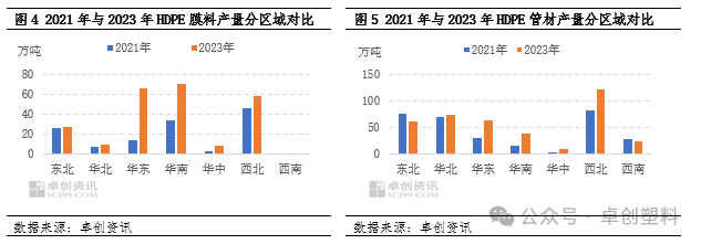 HDPE膜料来看,主要集中在华东、华南区域,分别增幅在385.68%与108.61%,华东区域主要受上海石化、镇海炼化、连云港石化影响,而华南区域主要因2023年广东石化的顺利投产,2023年广东石化HDPE膜料实际产量占华南区域总HDPE产量的近50%。