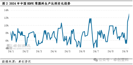 据卓创资讯统计,目前中国HDPE薄膜料在产企业涉及年产能共计410万吨,截至2024年9月10日,国内HDPE薄膜料石化企业生产比例达到13.02%,处于2024年内最高水平,近期市场货源供应较为充足,因当前生产比例处于年内高点,预计未来一个月市场HDPE薄膜料供应仍将处于较高水平。
