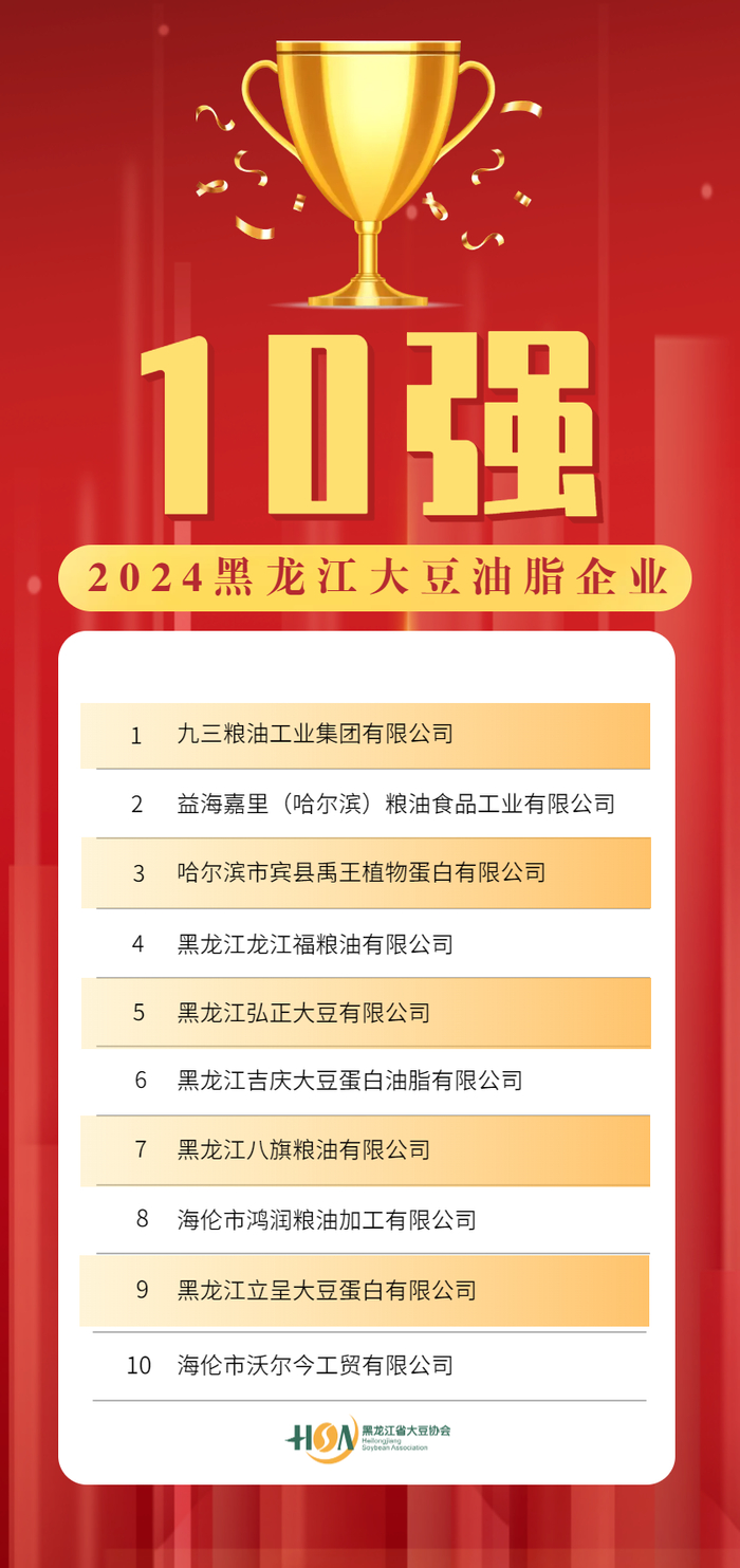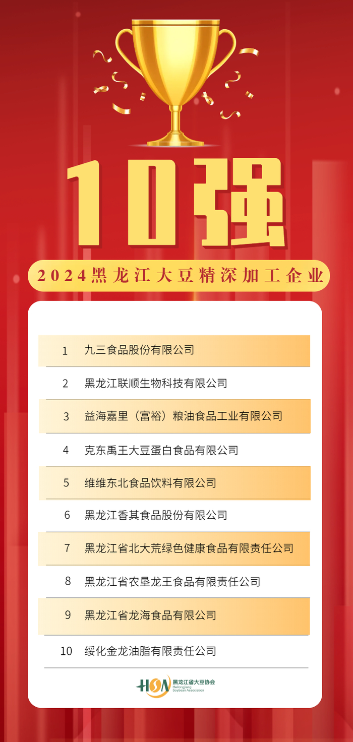 近年来,黑龙江省作为中国大豆产业的重要基地,一直以来都承载着保障国家粮食安全、推动农业现代化的重要使命。为推动黑龙江省大豆产业高质量发展,引导大豆加工企业晋位争先,持续为社会各界提供黑龙江大豆加工企业发展的相关数据与研究信息,省企业联合会和省大豆协会参照国际上通行做法和中国企业500强评价体系,以2023年企业营业收入为入围标准,经企业申报、公示、专家委员会审定,推出了“2024黑龙江大豆油脂企业10强”和“ 2024黑龙江大豆精深加工企业10强”。
