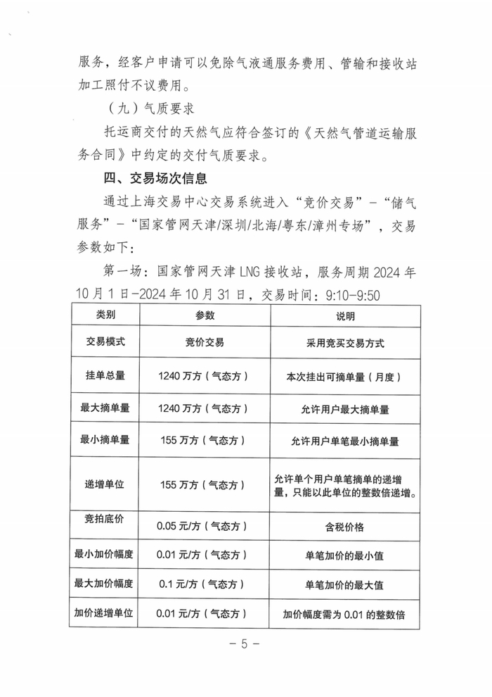 第一场:国家管网天津LNG接收站,服务周期2024年10月1日-2024年10月31日,交易时间:9:10-9:50