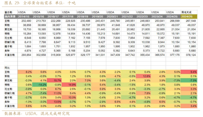 蛋白粕类的需求较为稳定,主要取决于全球人口的增长和全球GDP增速。我们预测2025年蛋白粕需求同比增3.4%,其中豆粕需求增5.4%,菜粕需求增0.1%。