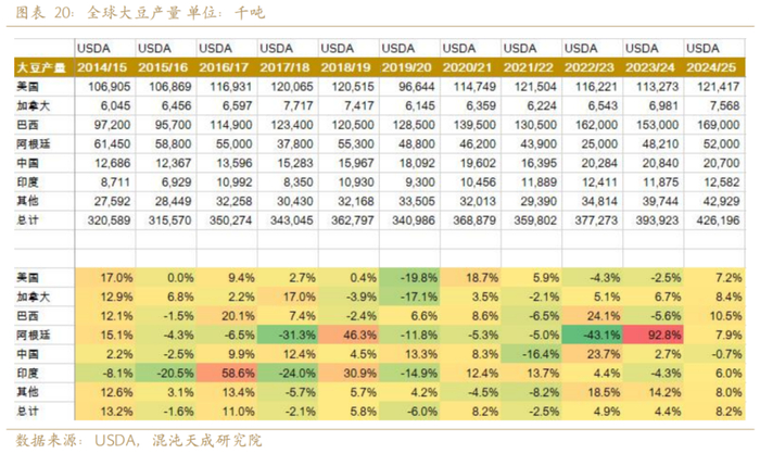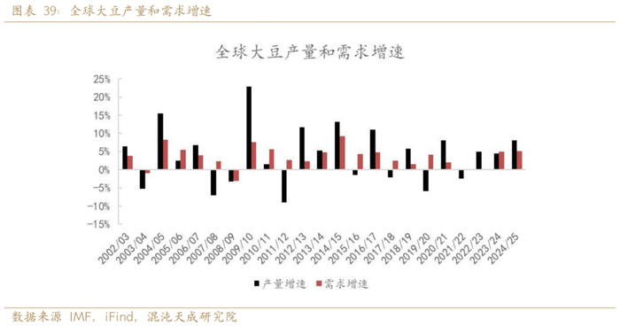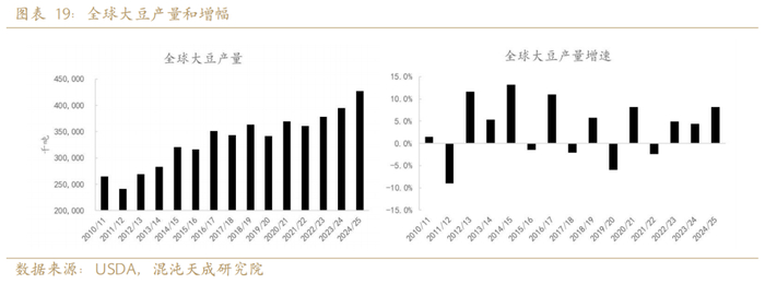 鉴于全球蛋白粕需求增速较为稳定,大豆的过剩和短缺主要取决于供给端的产量。由于受到天气影响较大,大豆产量的变化幅度远大于需求端蛋白粕的变化幅度。