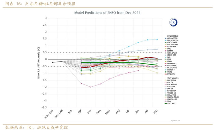 当赤道太平洋发生拉尼娜事件时,位于太平洋东岸的阿根廷和巴西南部降雨偏少的概率增加,历史上在拉尼娜年份大豆产区容易遭受干旱灾害,并导致减产事件发生。根据IRI的最新预报2025年1月可能会出现短暂的拉尼娜,2月之后恢复至中性状态,其持续时间较短,且大豆关键生长期为12月-1月,1月份之后大豆关键生长期已经结束,预计对大豆生长影响有限。