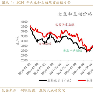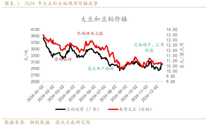 在2024年,大豆及豆粕市场在震荡中估值中枢下移。上半年,受宏观经济因素的推动以及巴西大豆收获期遭遇洪水的不利影响,豆粕价格出现反弹并上涨。然而,随着美国大豆生长季节的到来,缺乏天气炒作的市场环境下,丰产预期逐步实现,导致美豆价格在收割压力下逐步下滑至成本线,豆粕价格亦因原料端的驱动而跟随下跌。进入11月,市场焦点再次转向南美,巴西大豆种植仍具有盈利空间,市场预期种植面积将增加2.6%。截至12月,巴西大豆种植天气整体保持正常,市场对产量增长的预期进一步增强,大豆及豆粕价格持续走弱。豆粕2505合约更是创下自2020年6月以来的新低。