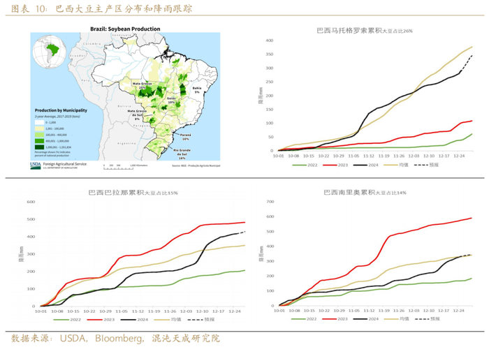 2024年10月开始播种的巴西大豆在仍然有不错的种植利润下,市场预期其面积将继续扩张2.6%。截止12月,巴西产区天气较为理想,假设一个正常的单产,市场预期其产量将达到1.7亿吨左右,较上一年度的1.53亿吨同比增加10.5%。